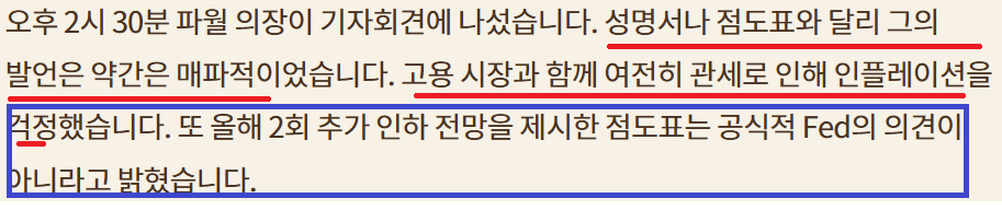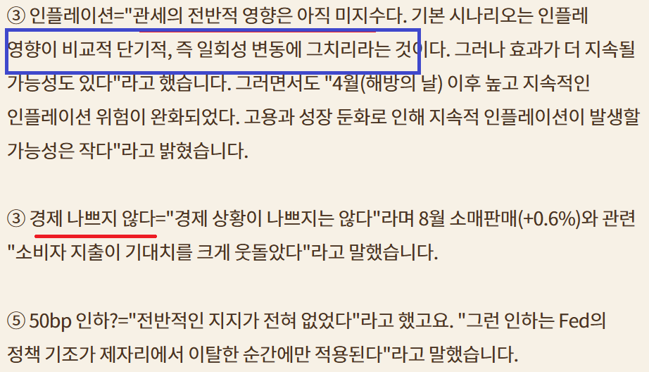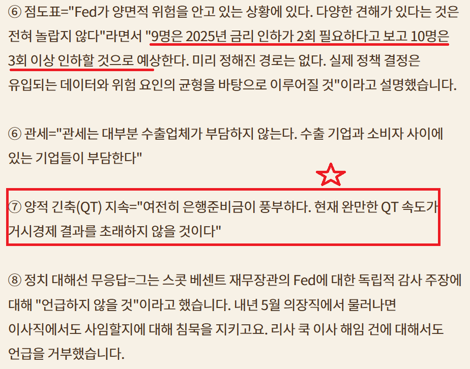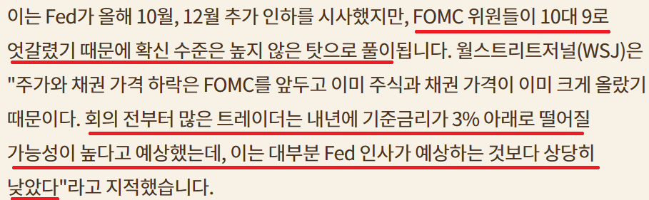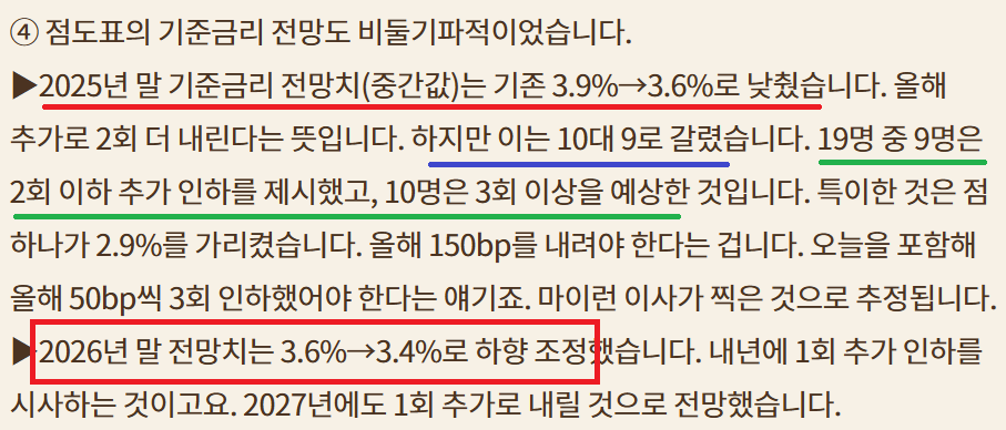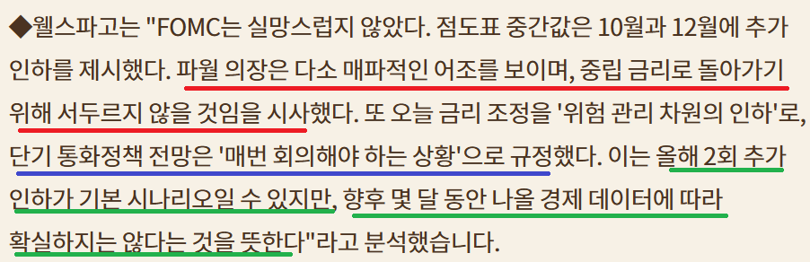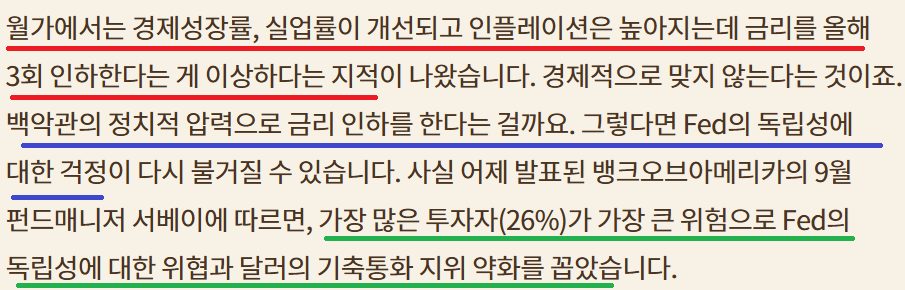 25bp인하 올해 3번 더 인하;고용에 초점;이민자 문제로 고용 보고서 엉망인데 금리는 왜 더 내림??;Fed 독립성에 대한 의문; 2회 더 인하와 3회 더 인하 팽팽;불확실성 증가