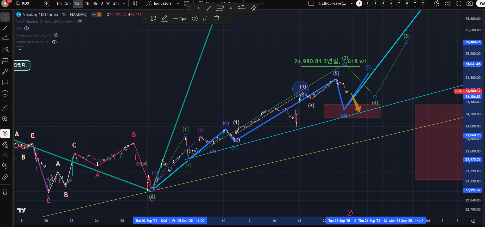 [Sky blue line의 5파 연장 임펄스 시나리오로 움직인다면 좌측 Red box부분까지 깊은 조정이 나와야한다;5파 연장 임펄스 경우 4파가 3파의 0.4 ~ 0.618사이까지 조정을 받아야한다. 아니라면 얕은 조정후 yellow green line 경로로(3파 연장 임펄스 시나리오); 즉 이번 하락이 어느정도 되는지 보고 결정을..하지만 아직 가상의 2-4 추세선까지는 거리가 있기때문에...느긋하게]