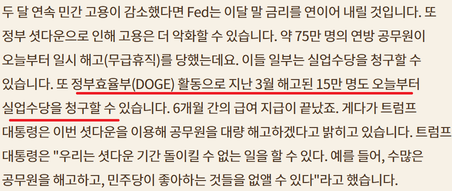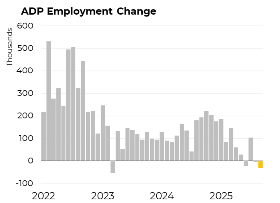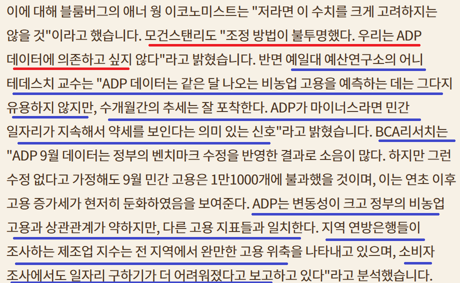 Nonfarm payroll이 확인되지 않는 상태로 ADP 고용수치로 추정; 수개월간의 추세 연관성 및 최근 다른 노동시장 약화를 고려할때 충분히 노동시장 약화을 예상할수도