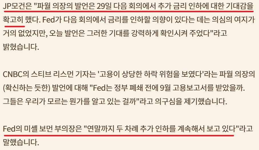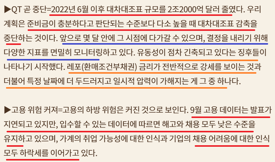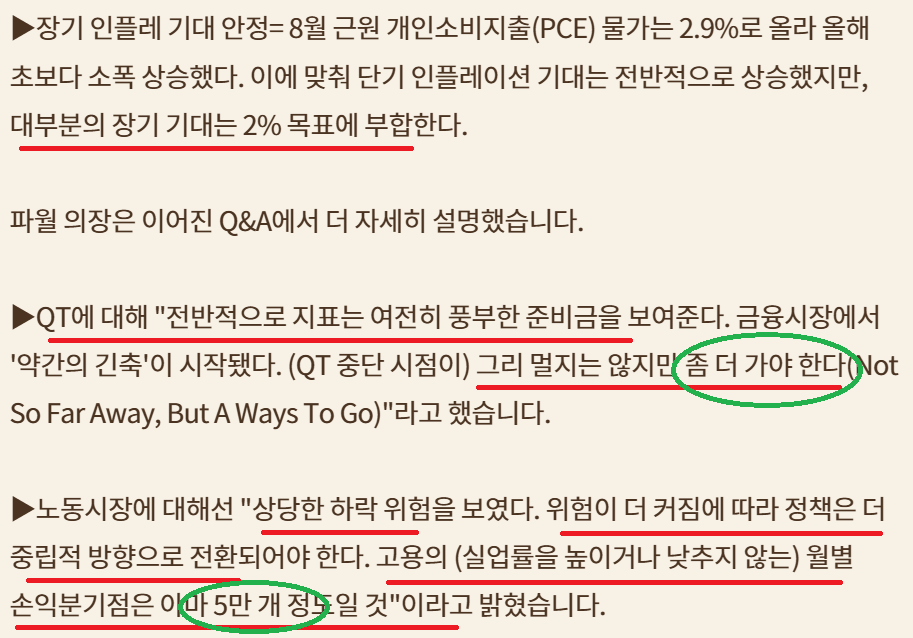 파월 NABE 발언: QT는 조금더 진행, 고용하방위험으로 금리 인하 지속(장기인플레이션은 2%대)