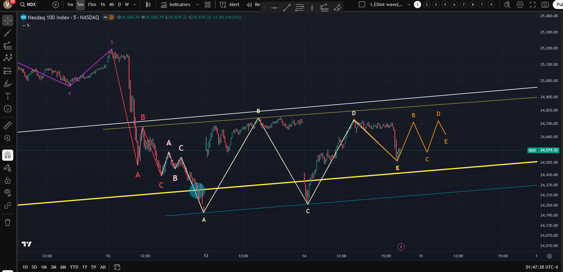 [다른 시각으로 보면 작은 x파를 매우 작게 끼워 넣고;지그재그 다음 작은 x파는 시간이나 가격적으로 매우 작게 나오는게 일반적이며 x파 앞의 파동과 다른 형태인 플랫으로;이후 거의 평행 채널 안에서 움직이는 형태로...삼각형 형태를 고려해 볼수 있고, 삼각형 e파에서 다시 삼각형이 들어가 있는 형태도 고려해 볼수 있다;어느쪽이든 상승 방향인데...현재는 하락 관점이기때문에 삼각형의 반응이 확실히 나오고 나서 포지션을 정해야 할것 같다]