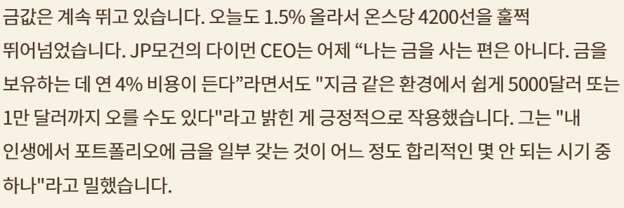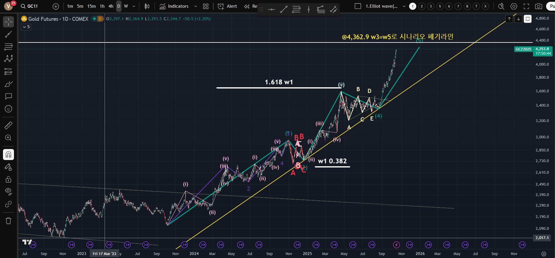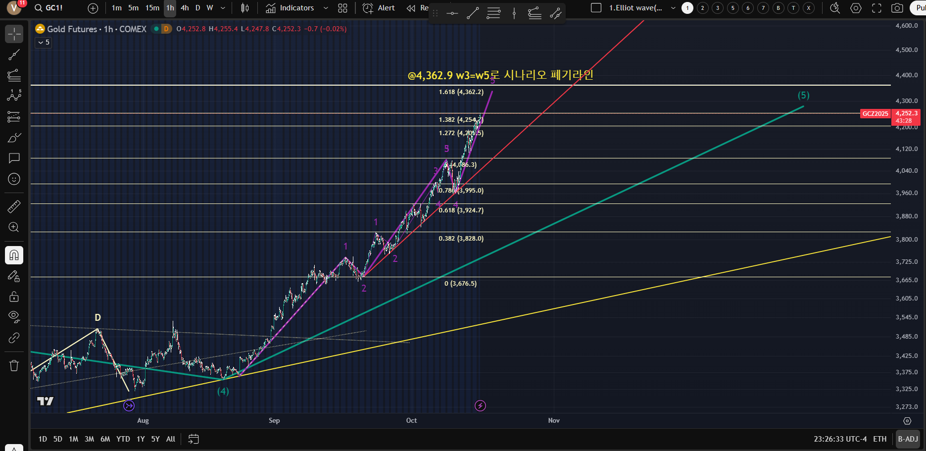 [금 선물 차트; 특별한 조정없이 상승중; 파동으로 볼때 1차 한계선은 4,362.9; 여기가 깨지면 다시 카운팅 해야하지만 현재 포지션을 유지하도록...더 사둘껄..껄무새]