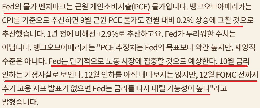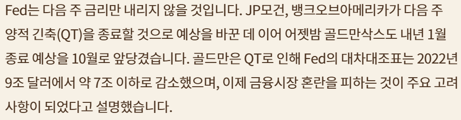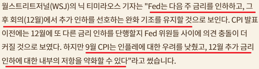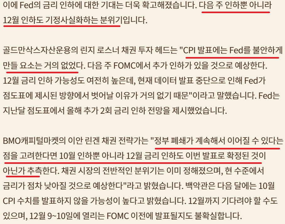 9월 CPI 데이터 양호; Fed 금리인하 지속 및 QT 중단 기대감 커져
