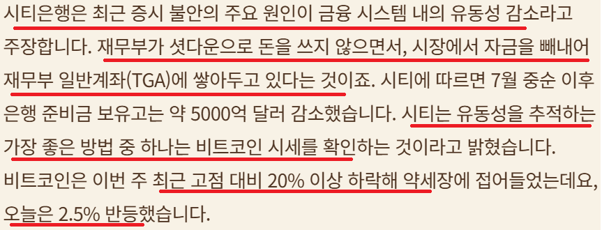 CITI 보고서; 최근 증시 조정은 유동성 문제로; 연방정부 재정집행이 이루어지지 않고 TGA 계죄에만; 유동성 지표인 비트코인 하락세; 뉴욕 연은 윌림어스 연준 자산 매입 시작 가능성 언급