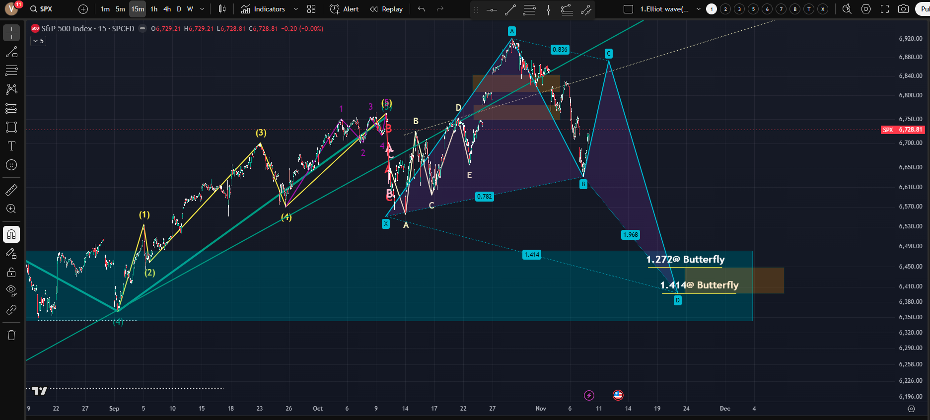 [금요일 시장이 반등했다; 하모닉 패턴의 Butterfly pattern이 나오고 있다;이전 Gately 등 패턴등은 제거된 상태; 반등후 다시 하락을 생각해야하는데...가능한 Macro 시나리오를 그려보아야한다. 단기간 해결이 되지만 큰 위험의 존재인데...단기 해결은 연방정부 셧다운이 될건데....큰 위험은 역시 AI 고평가 문제다]
