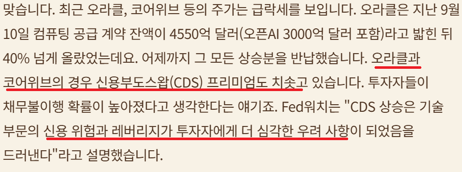 Open AI 자금조달 관련 우려 지속; 오라클, 코어위브 CDS 프리미엄 상승 중