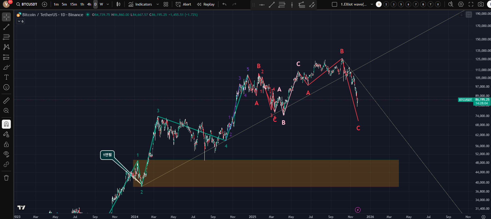 [조정파 c구조 출현중? 내부 2-4 추세선을 안정적으로 돌파전까지 유동성의 지표로 유심히; 4년만다 반감기이며 2024-04이후 2025-10까지 상승후 현재는 약세장으로 간다는 기존의 통계로 간다면 2파 영여까지 조정 가능?]