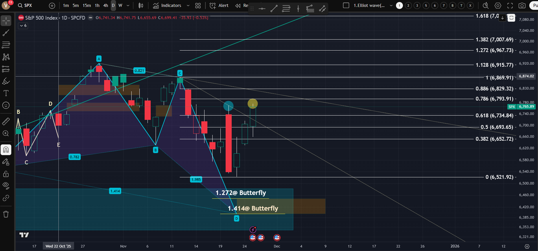 [NDX와 다르게, 조정파동을 진행하면서 고점을 넘어서는 모습이다. 이러면 나가리인데 해석의 모호함이 커진다. 결국 조정이 아닌 상승 국면으로 전환도 고려한다고 하면 현재는 어느 한쪽의 의견이 우세하지 않는 관망의 구간이다. 더군다나 추수감사절로 시장 움직임이 크지 않을 것이므로 더더욱 조심히 바라봐야할 것 같다]