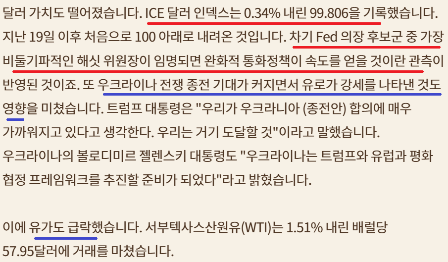 캐빈 해싯 다음 연준 의장 유력 (블룸버그); 금리 하락, 달러인덱스 하락;러-우 전쟁 종식 기대감으로 유로화 강세, 유가하락