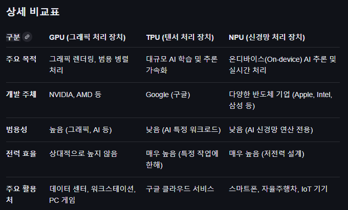 GPU vs TPU vs NPU 차이점 by Gemini