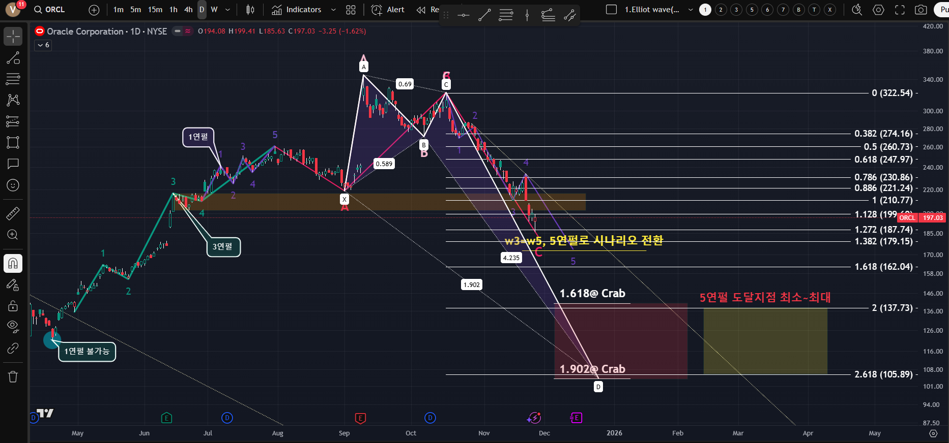 [3연펄 시나리오를 지나서 5연펄 하락 시나리오로 가면 무섭게 내려가는데...문제는 Harmonic pattern 근처다. 1.618 Crab & Deep crab과 1.902 Crab의 도달범위가 5연펄의 최소(1-3파 ext 2.0)에서 최대(1-3파 ext 2.618)랑 비슷하다. Short ETF가 있지만 거래량이 많지 않아 돈을 벌어도 빠져 나올수가 없을수도..]