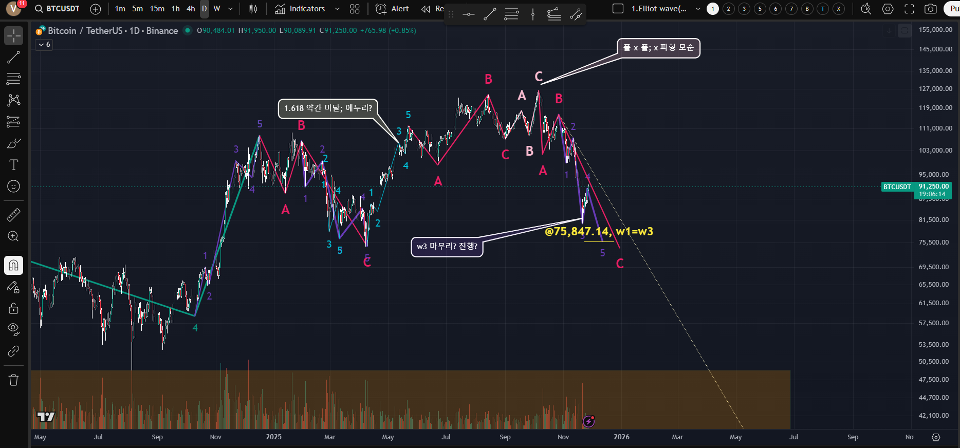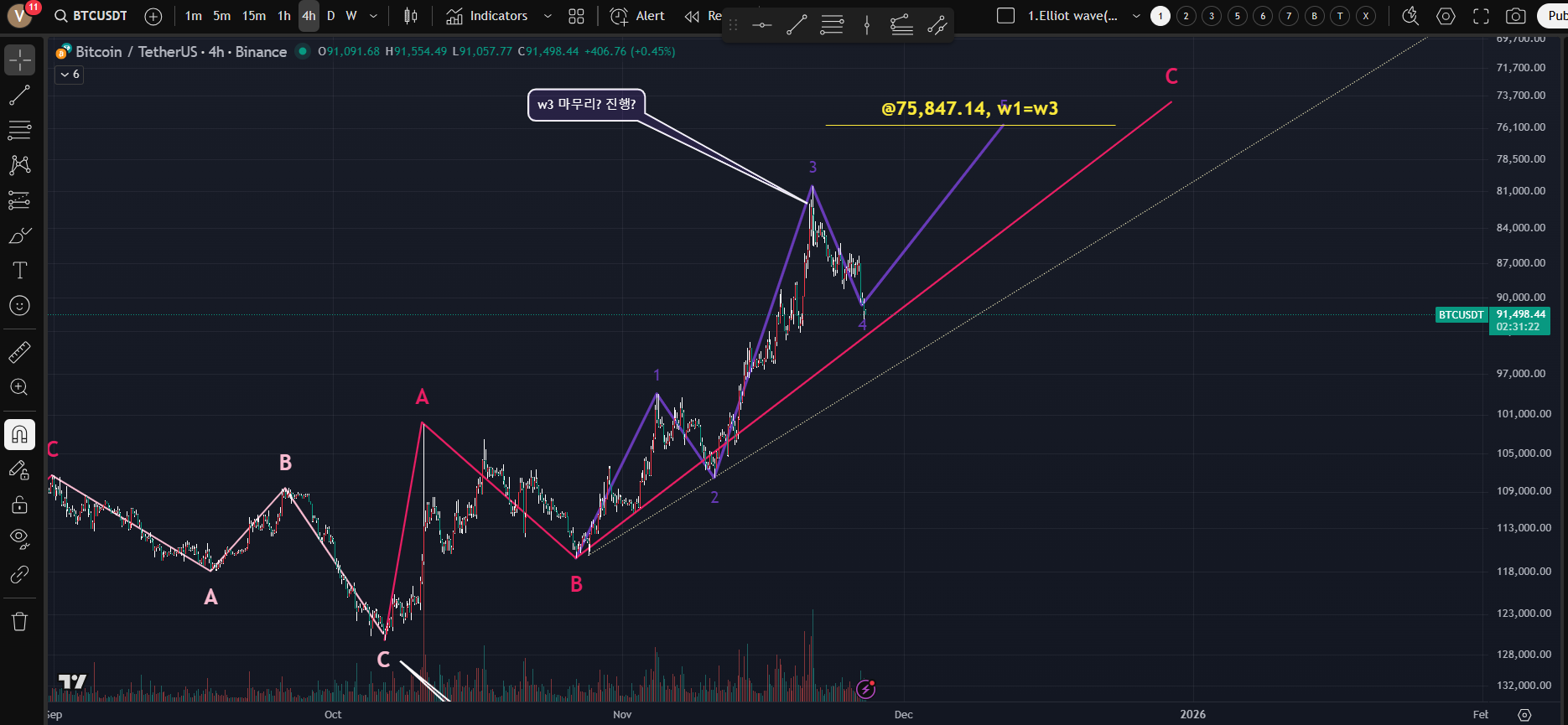 [뒤집어서 보면 조금 더 명확하다. 3파가 종료 후 4파까지 나왔다면 다시 하락할 수도...주말에는 주로 횡보하므로 추수감사절인 며칠동안 움직임이 명확하거나 다음주로 넘어 갈것으로 보인다. 아직 관망의 시간; BITO나 BITI 등 ETF로 추종할수 있지만 월말 배당락이 있기때문에 추수 감사절 후 포지션을 정하는 게 나을듯 하다]