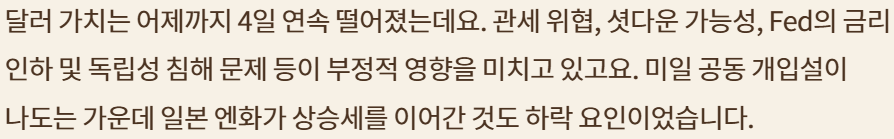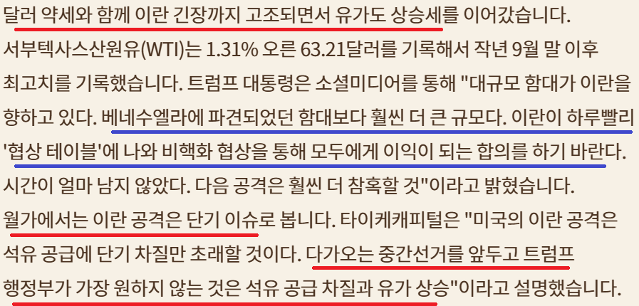 달러 약세 지속; 트럼프 OK but 베센트는 강달러 원하는 미묘한 부조화; 원자재 특히, 금/은 강세 지속; 이란 관련 지정학적 위기로 유가 상승; 중간선거 고려한다면 유가 관련 이란 이벤트는 일회적이라는 예측