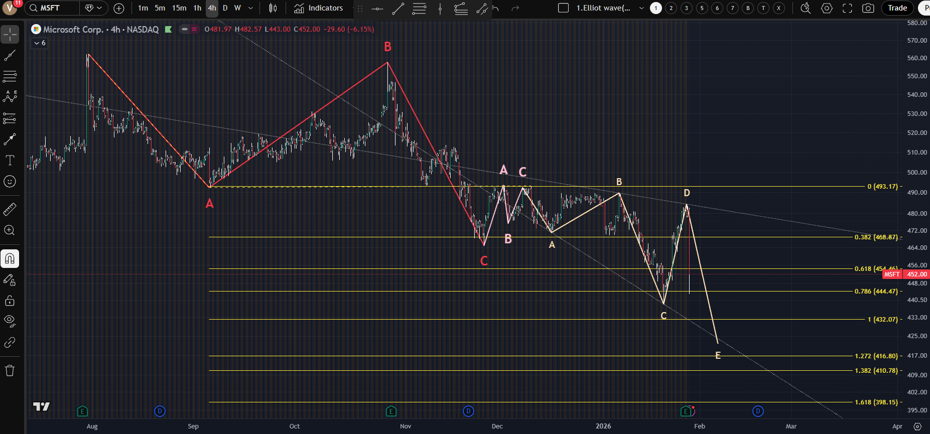 [실적발표 후 시간외 급락중; 조정파들 사이에서 형성되는 Extended Fibonacci 0.786 (@444.47)부근까지 터치; 플랫조정-작은x파-확산삼각형 구조로, 이중 또는 삼중 조합의 마지막 부분에서 나오면 반드시 e파 fake out을 해야하기때문에 더 기다려야할 듯 하다.이후 전부 되돌린다면 고레와 찬스데스! 이런 이야기 믿지 않더라도 떨어지는 칼날을 잡으면 안된다!]