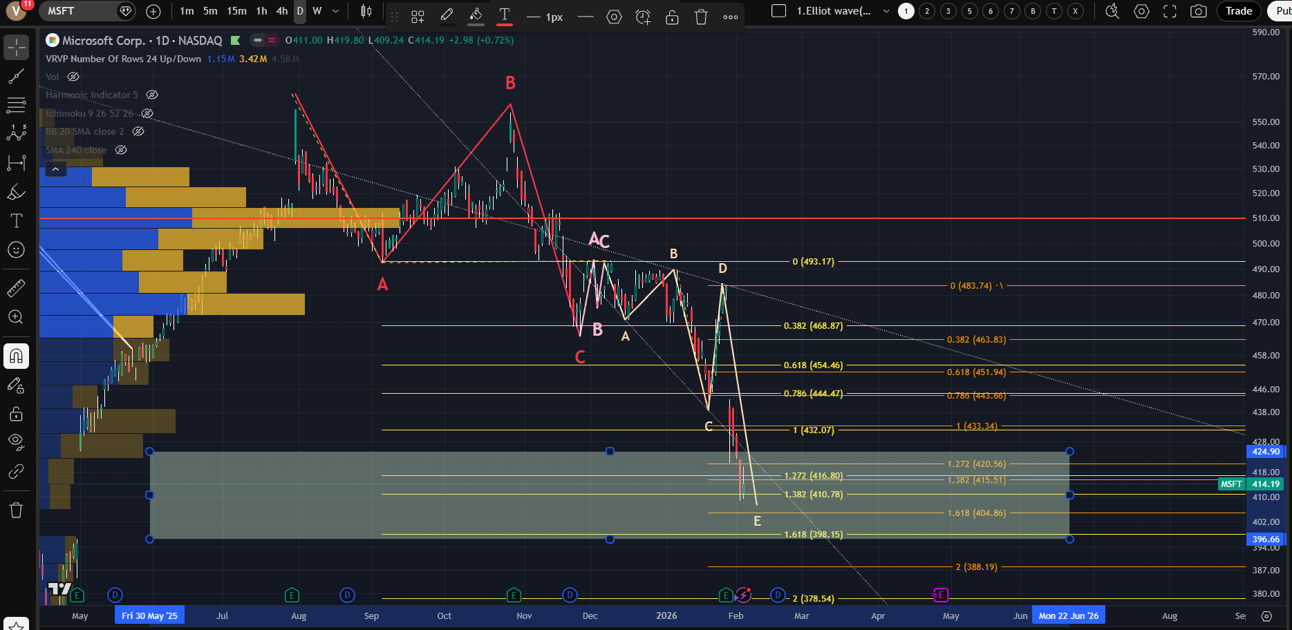 [주요 Fibonacci 선들이 모이는 지점까지 왔다. 다만 404$을 깨버리면 매물대가 없기 때문에 한차례더 급락이 가능하고 다음지지선으로 388$까지도 봐야할듯하다. 여러모로 SaaS의 수난시대다. 더군다나 MSFT는 혁신이 안보인다.]