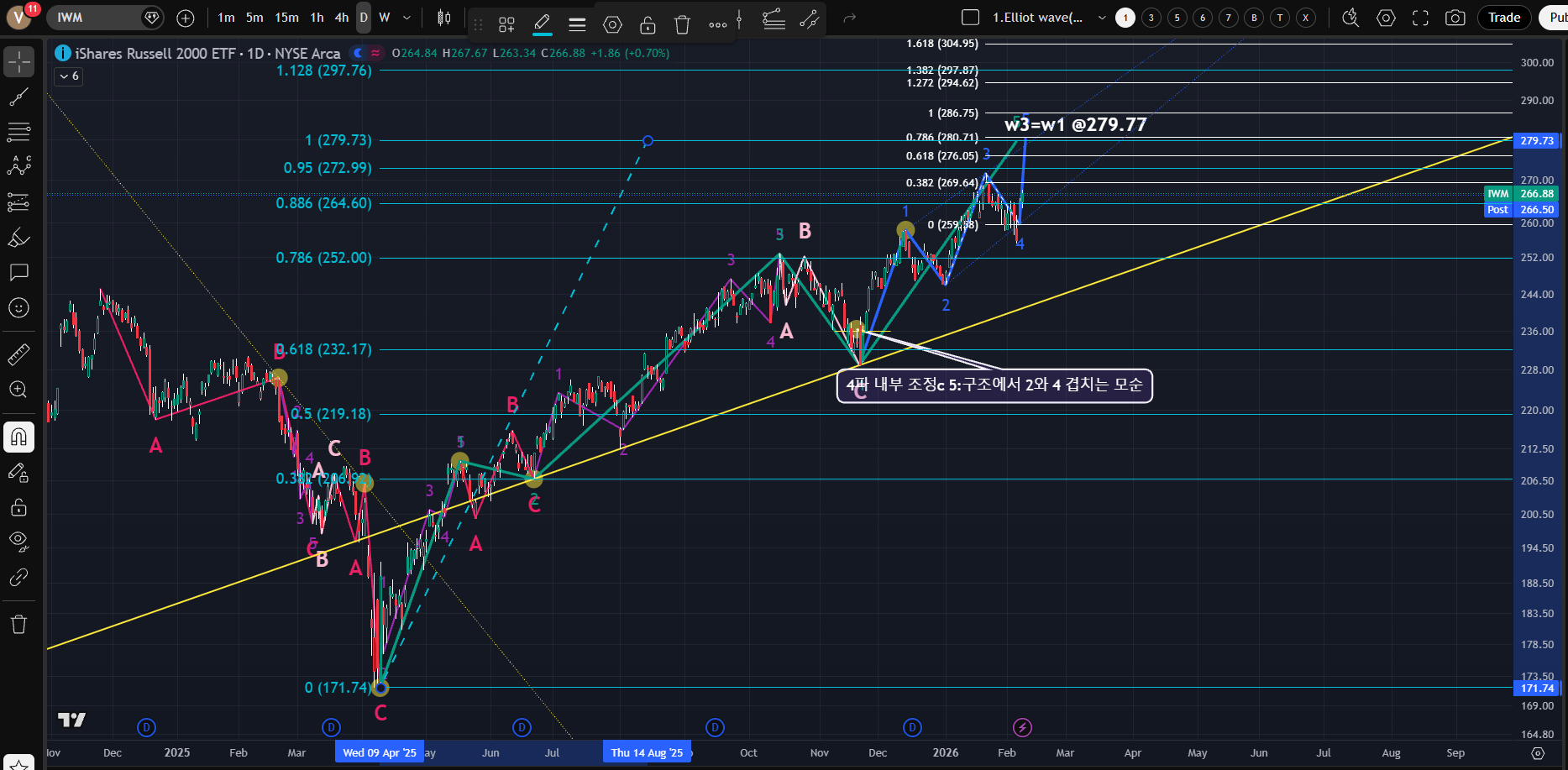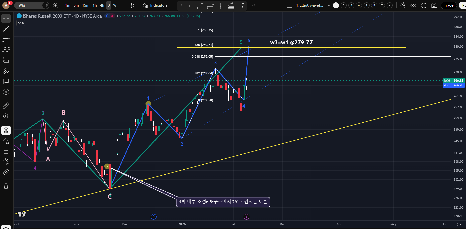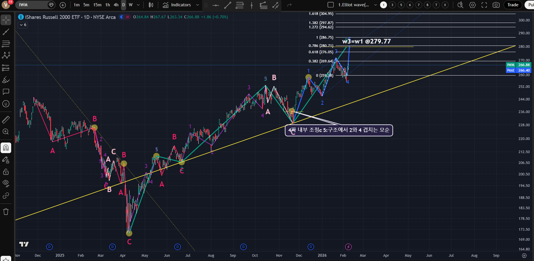 [순환매 추이를 보고자 계속 모니텅링 중으로, 파동이 마무리 되지 않는 상태로 많은 모순점을 내포하고 있다. 전체 1파 연장 임펄스로 가정하고 예상 종료지점에서 Fibonacci를 나누면 2파 종점, 3파 종점과 잘 일치하며 내부를 최대한 모순 없게 잡을수 있지만 4파 내부 조정 "c"의 5: 구조에서 모순점은 해결하기가 쉽지가 않다.]