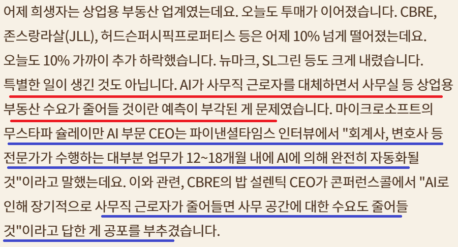 AI 공포로 과매도 지속; 물류업체 & 상업용 부동산; 하지만 닷컴버블처럼 거품 현상도; 오히려 과매도의 기회일수도; 시장이 하락해도 메모리 반도체는 양호