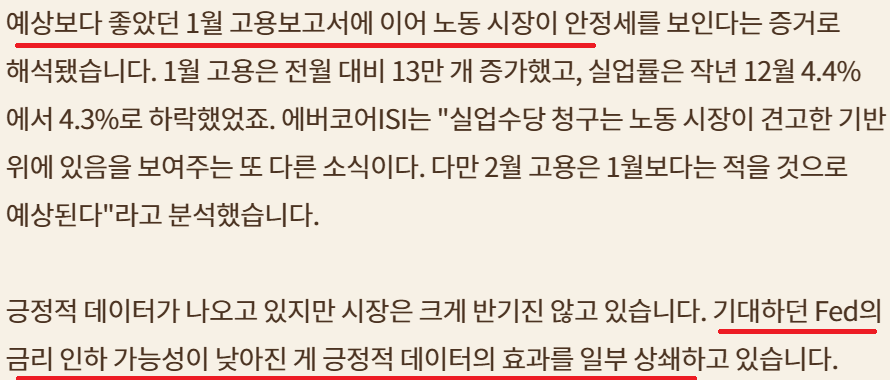 실업청구 수당 데이터 양호; 노동시장 안정세로 금리 인하 기대감 계속 낮아져; 내일 CPI 데이터로 시장 단기 방향이 나올듯