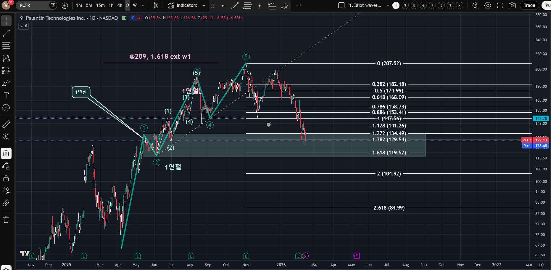 [1파 연장 임펄스 후 조정 중이다. 조정 "a" 외부적 비율과 충격파의 2파 시작점(1파 연장 충격파의 ...