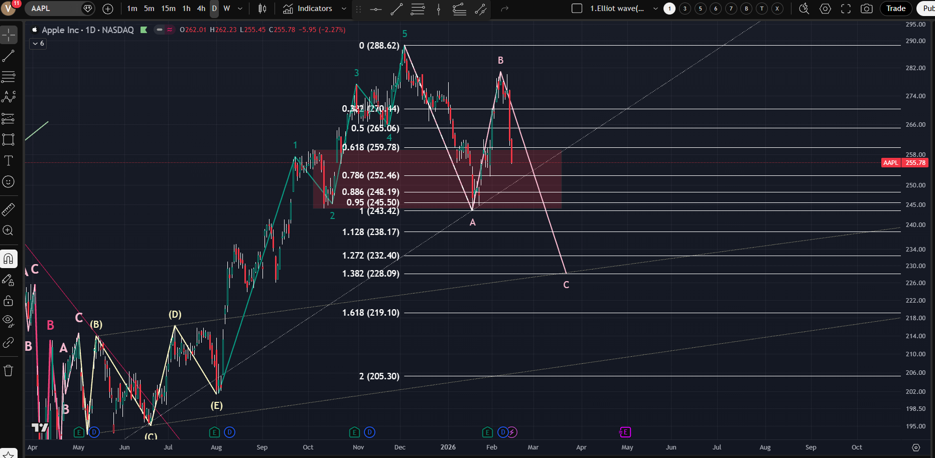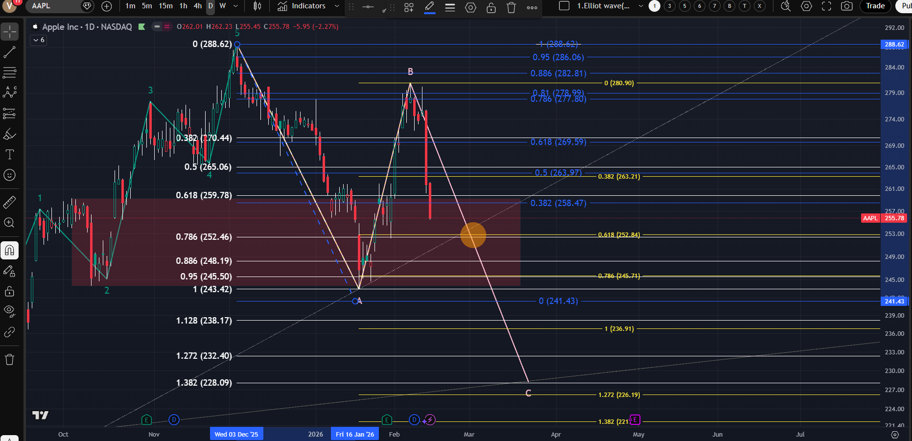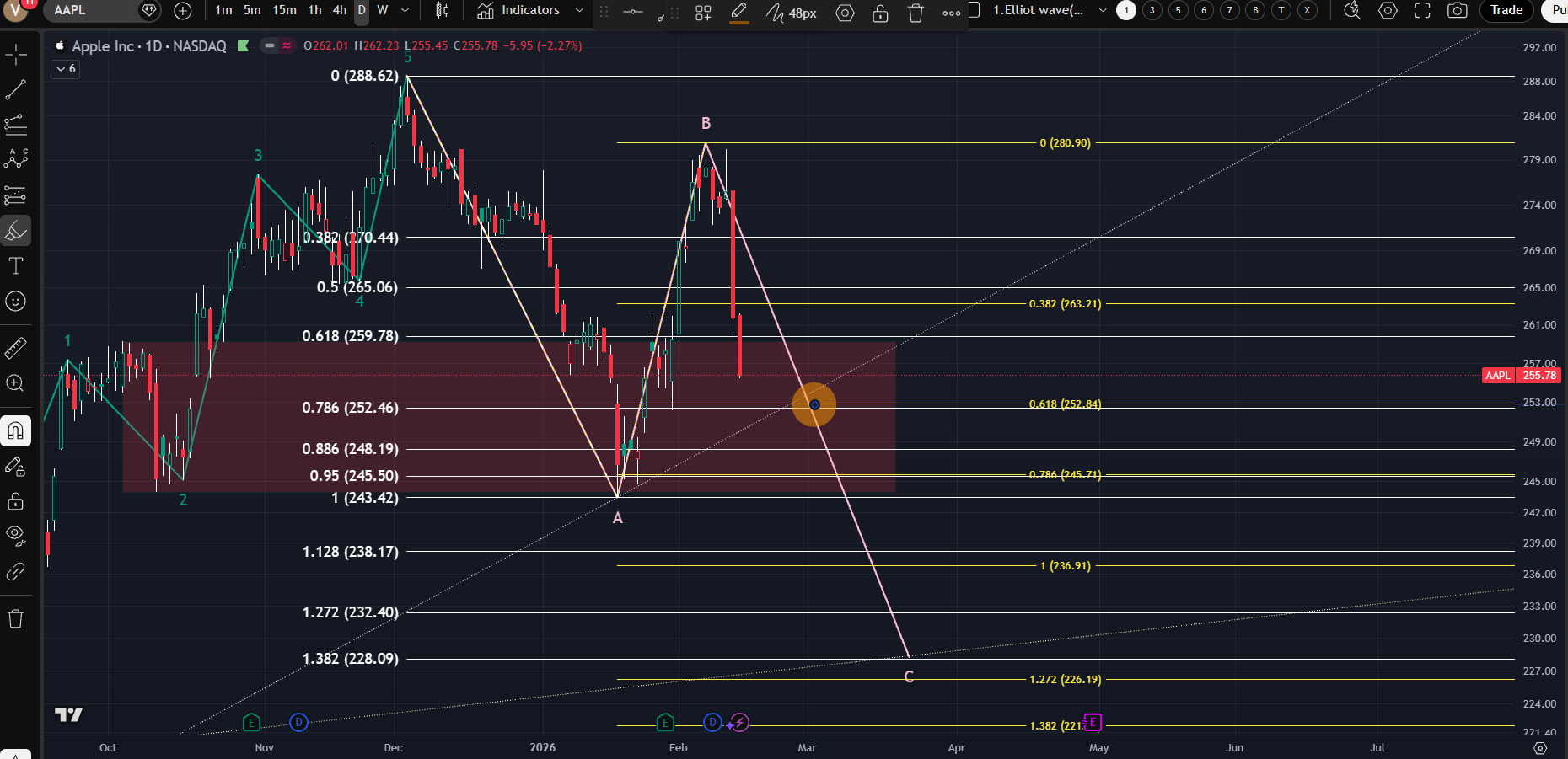 [고점도 $SPX:INDEX 와 다르게 늦게 나왔으며 이후 조정도 크게 발생중이다. 플랫 조정 형태로; 플랫은 b파의 길이에 따라 분류하는데 일반b파(0.81a<b<1.0b)로 이후 미달 c, 일반플랫, 연장 플랫 모두 가능하다. Fibonacci가 겹치는 부분을 후보로 들면 252.46~252.84 부근에서 한번 반응이 나올것으로 보인다. 이러면 미달 c파 플랫 조정으로 마무리하고 이후 되돌리는 힘의 부족으로 다시 되돌려질것이다. 즉 이후 상승으로?, 또한 이때 b파는 이중재그일 확률이 높다고하는데 모양은 전혀 아니다.]