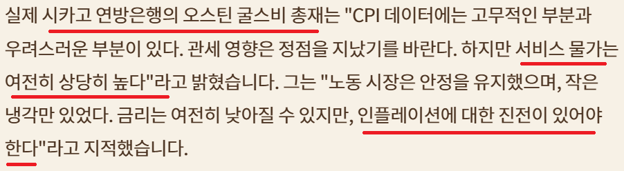 CPI 예상보다 낮아; 금리 기대감 높아져; 시카고 연은 굴스비 총재 서비스 물가 우려