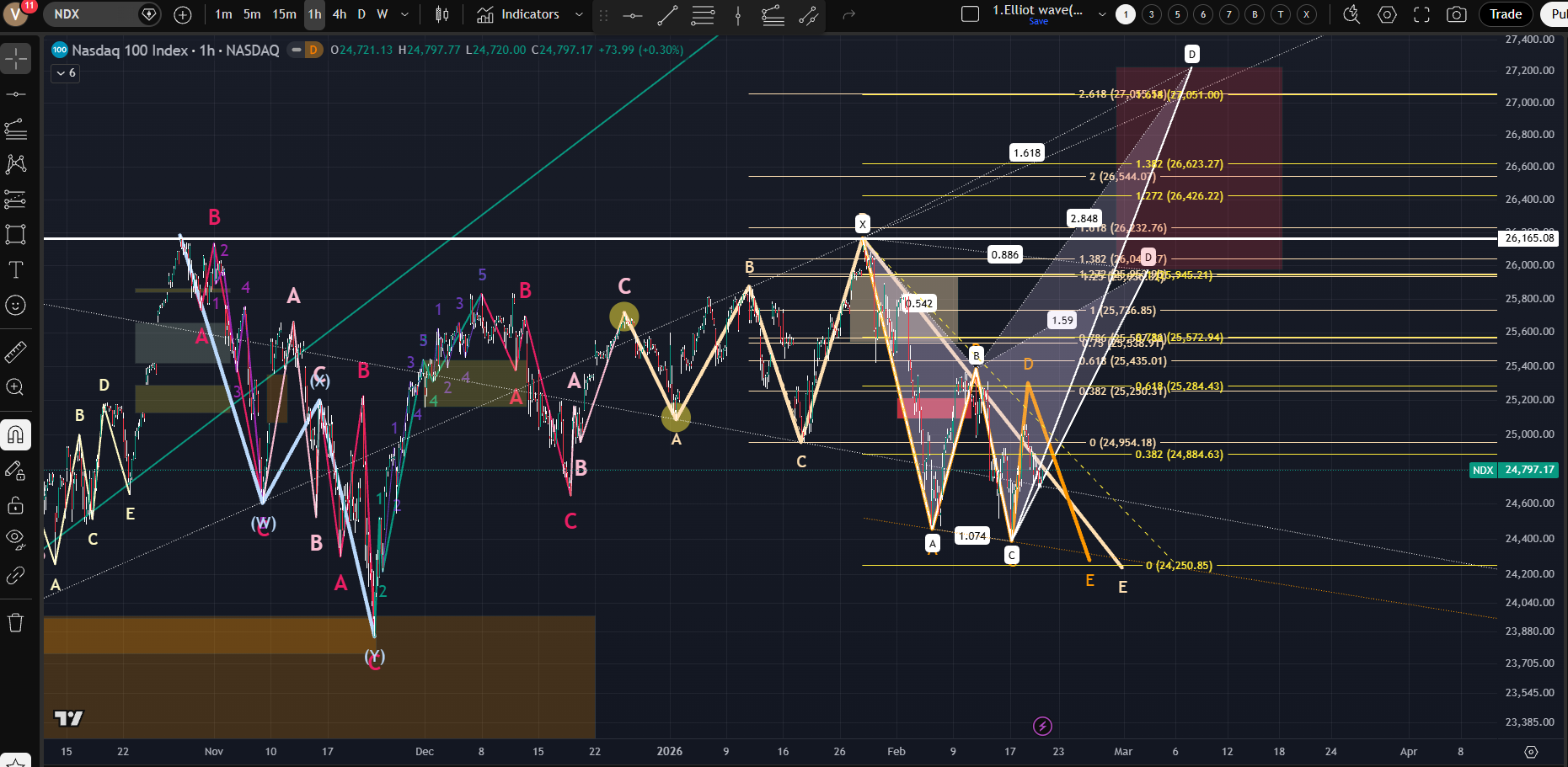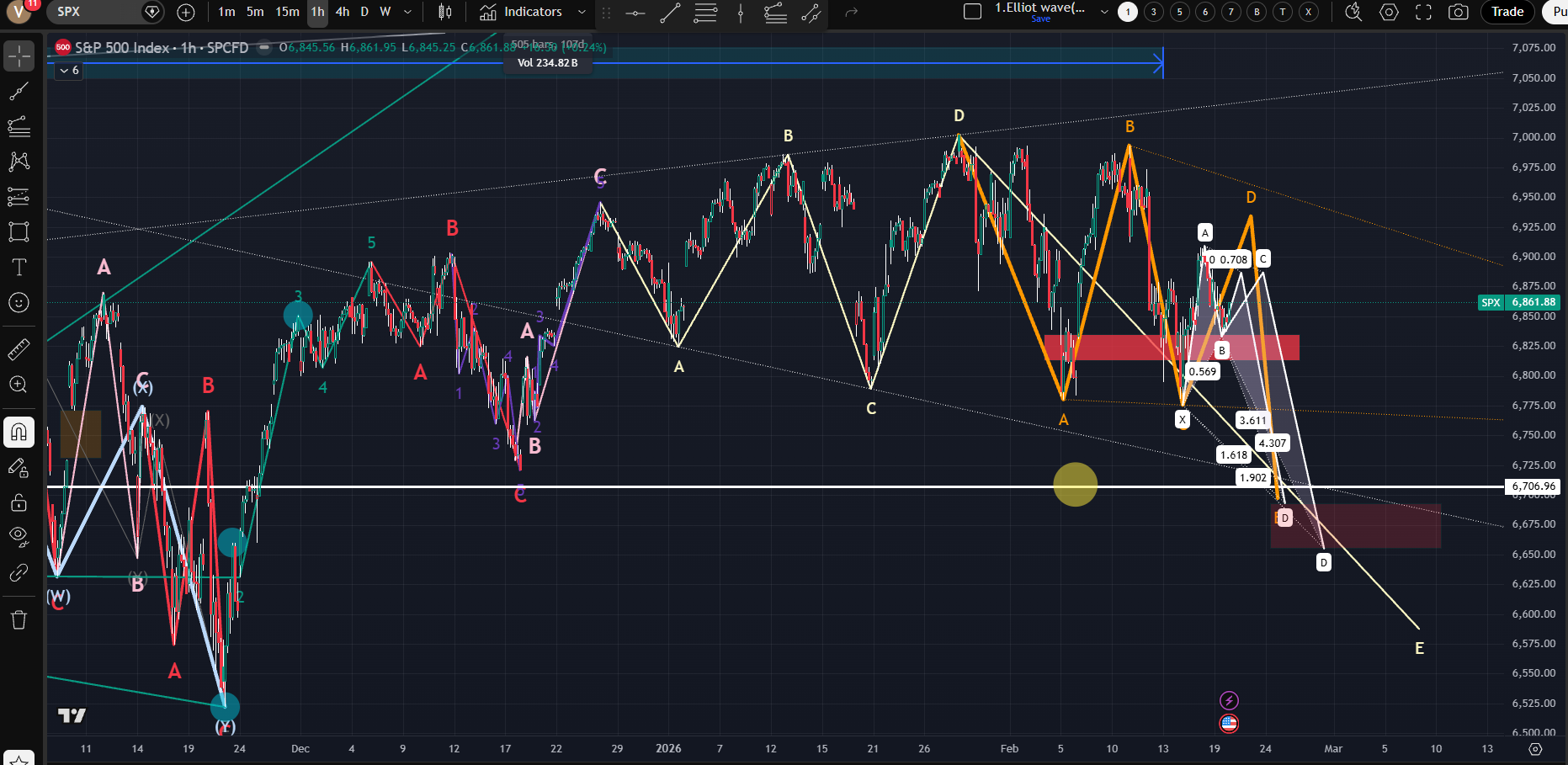 [삼각형 e파에서 다시 삼각형이 이어지는 것으로 생각중...큰 삼각형이 무제한 확산이라고 하면 뒷부분이 플랫 파동일 가능성도 다분하다. 어떻게 되든 위아래로 확실한 방향을 보여줘야하는데..하락후 상승을 생각중이고...옵션 만기일, 이란 제한적 공격, IEEPA 판결 등 이슈로 한번 끄집어 내리고 진행할듯한데....낙폭이 너무 적기때문에 조금더 기다리기로...지루하다]