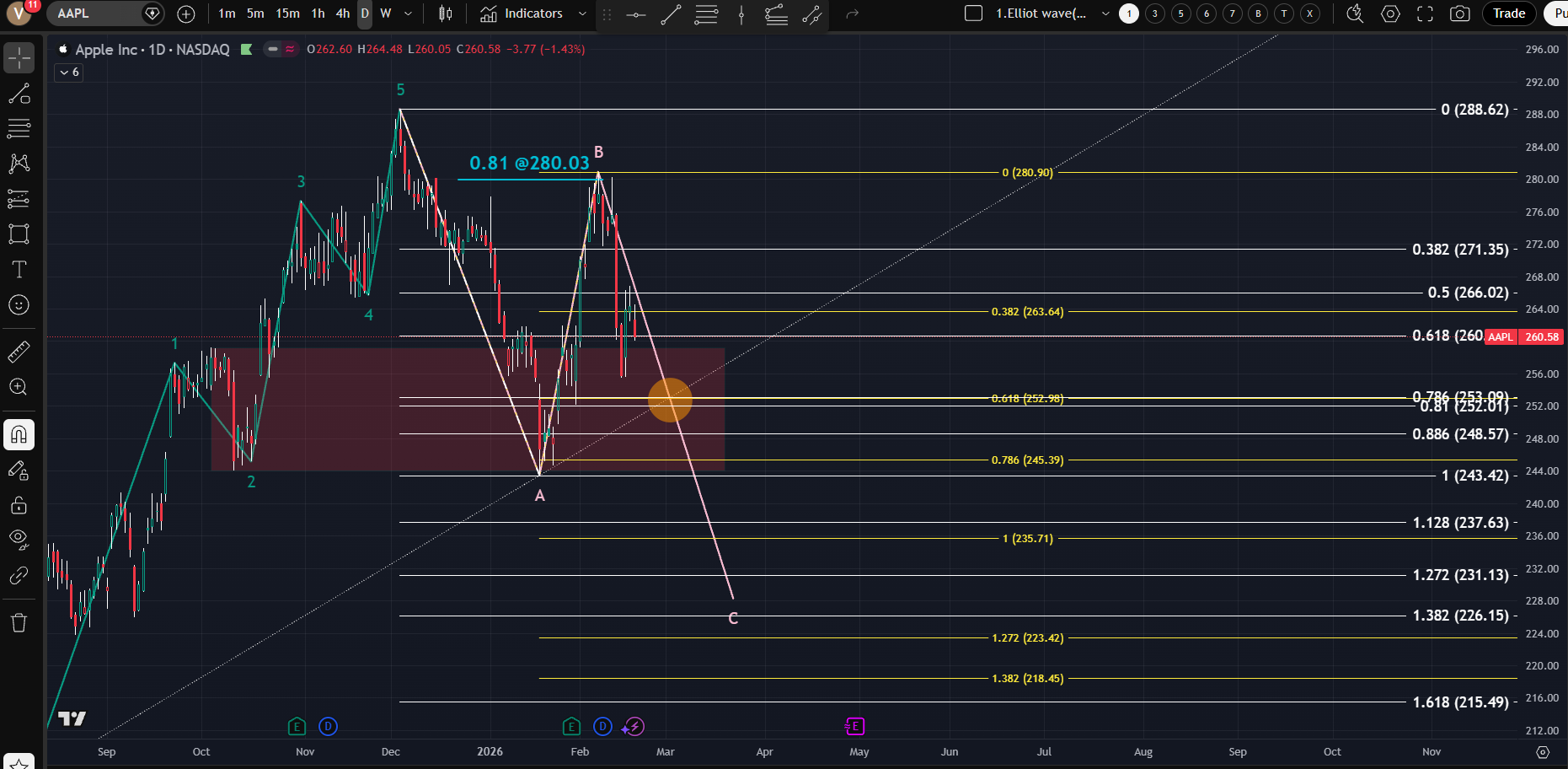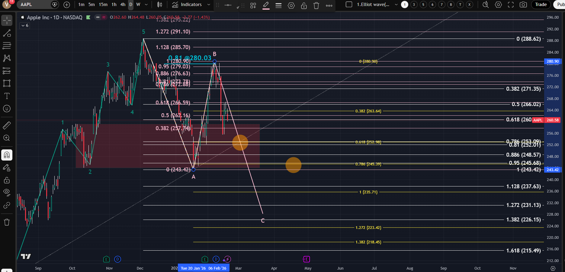 [플랫 조정중이다; 일반 b파(0.81~1.0 *a)이후 진행중으로 미달 c파 이더라도 적어도 b파의 0.618 되돌림인 257.74$ 한번 터치한 상태이다. 이후 "c" 구조는 충격파인 5: 구조로 진행하기때문에 이후의 하락을 좀 더 지켜봐야할 듯하다. 추가로 이후 잠재적 가격 반전구간 후보로 Fibonacci가 겹치는 252~253$구간에서 변화가 있는지 살펴봐야겠다]