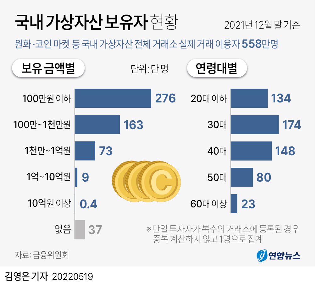 내가 평소에 생각한 것은 '아무래도 젊은 사람들이 새로운 것에 관심이 많은 법이니, 가상자산도 2030이 가장 많지 않을까?' 했는데, 결과는 조금 달랐다. (당연히?) 가상자산을 보유한 사람들 숫자는 2030이 가장 많긴 했으나.....평균 보유액은 60대 이상이 가장 많았다.