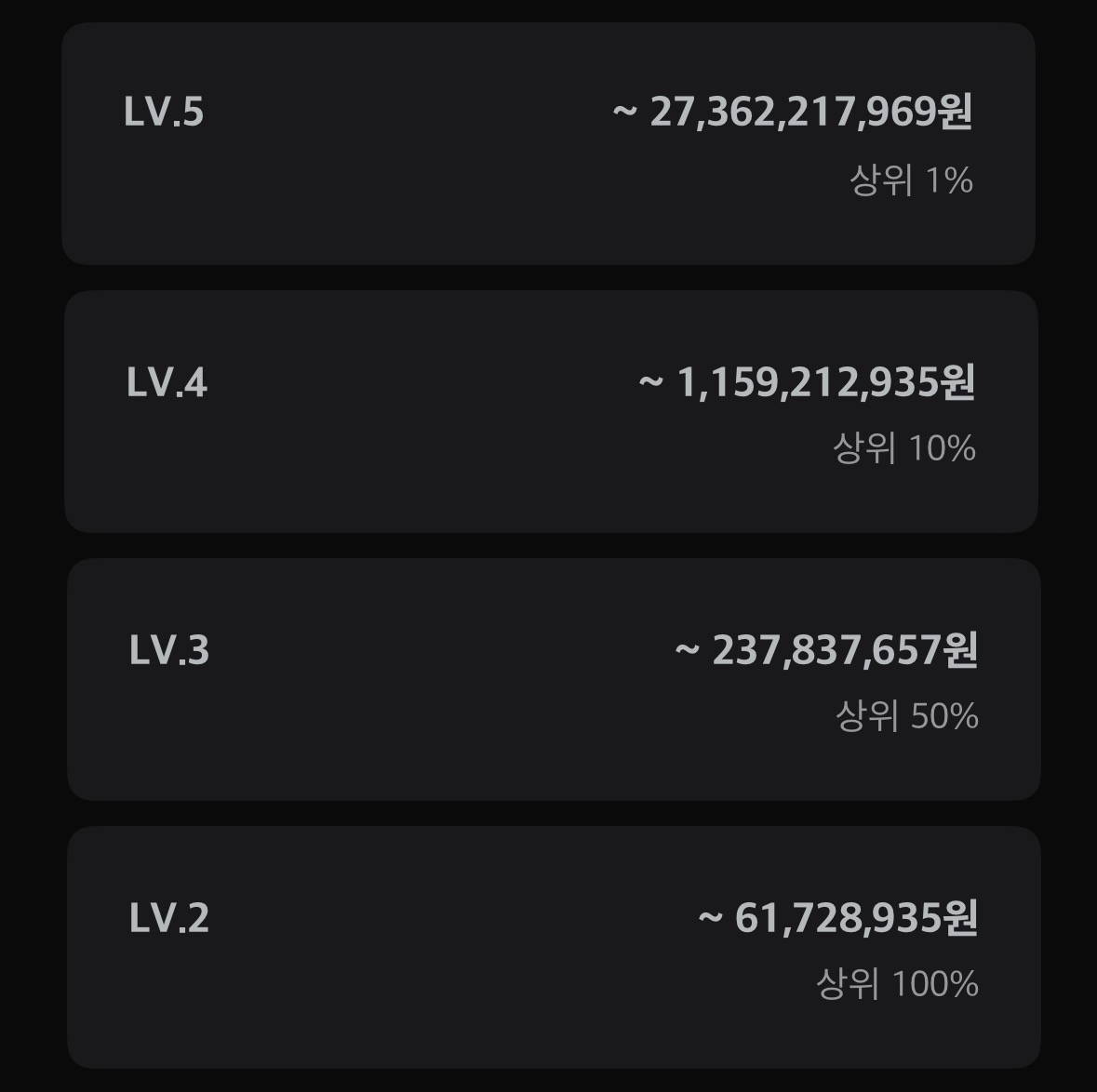 등급이야 뭐 얼마나 가지고 있느냐에 따라 달라진다. 0.3-1-3-10억원으로 짤랐다. 윗단계로 올라가려면 기하급수적으로 많이 보유해야 한다.
