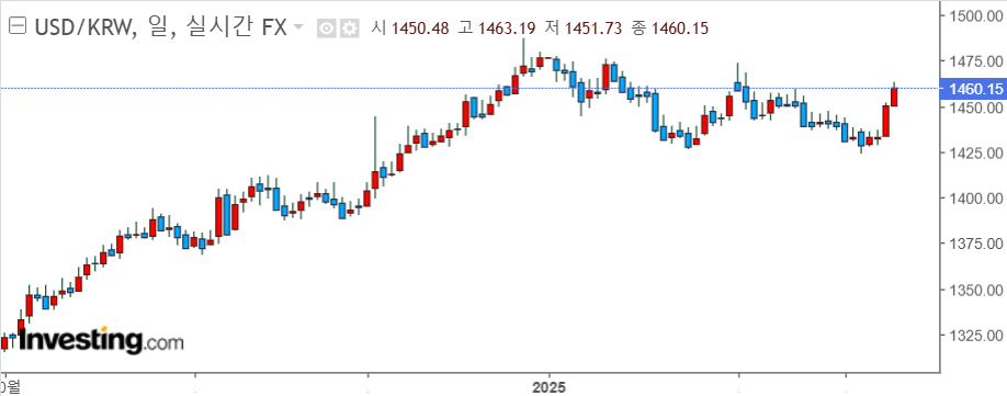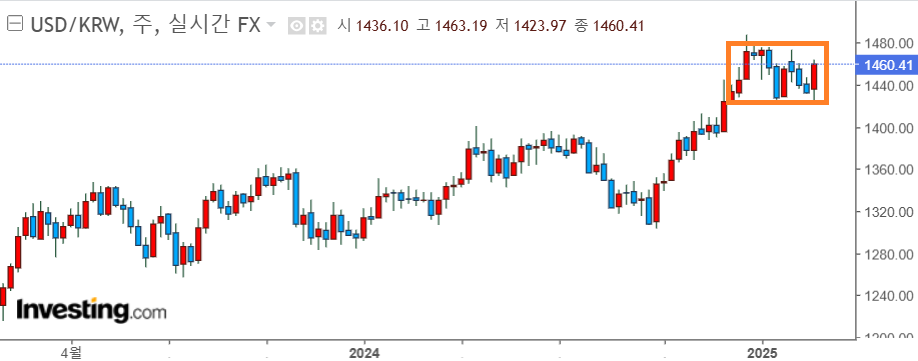 10월부터 달러원 환율은 올랐고 12월초 계엄 사태 이후 상승이 더 가팔라졌지요. 그러다가 12.27일 한덕수 국무총리 탄핵이라는 사건이 났음에도 달러는 1485에서 더 이상 오르지 않습니다. 그러다가 하락합니다. 하락장은 상승장보다 대개 변동성이 더 크지요. 하락도 급하고 반등도 급합니다. 1월 하순 1430을 밑돌았지만 트럼프의 말 한 마디에 급히 1470까지 갑니다. 그러다가 또 하락. 힘이 없습니다. 1400이나 1370까지도 갈 것 같았습니다.